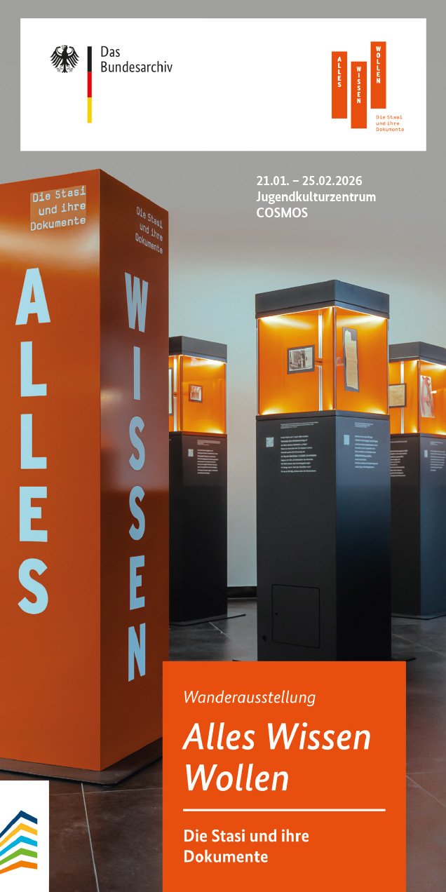 Das Bundesarchiv - Stasi-Unterlagen-Archiv bringt die Wanderausstellung „Alles Wissen Wollen. Die Stasi und ihre Dokumente“ auf Initiative der Volkshochschule Coburg – in Kooperation mit dem Cosmos Coburg, dem Europe Direct Coburg und mit Unterstützung der Kulturabteilung der Stadt Coburg – in die Vestestadt. Vom 21. Januar 2026 bis 25. Februar 2026 sind Objekte aus den Beständen des Archivs im Jugendkulturzentrum Cosmos am Anger zu sehen – darunter Observationsfotos, Planungskarten und persönliche Gegenstände von Betroffenen.