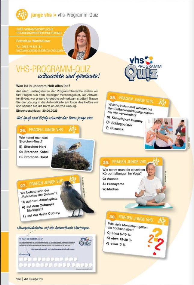 Wie bereits im letzten Semester gibt es auch im aktuellen Katalog ein Quiz. Auf allen Einstiegsseiten der Programmbereiche stellen wir fünf Fragen aus dem jeweiligen Wissensgebiet. Die Antworten findet, wer unsere Angebote aufmerksam studiert!